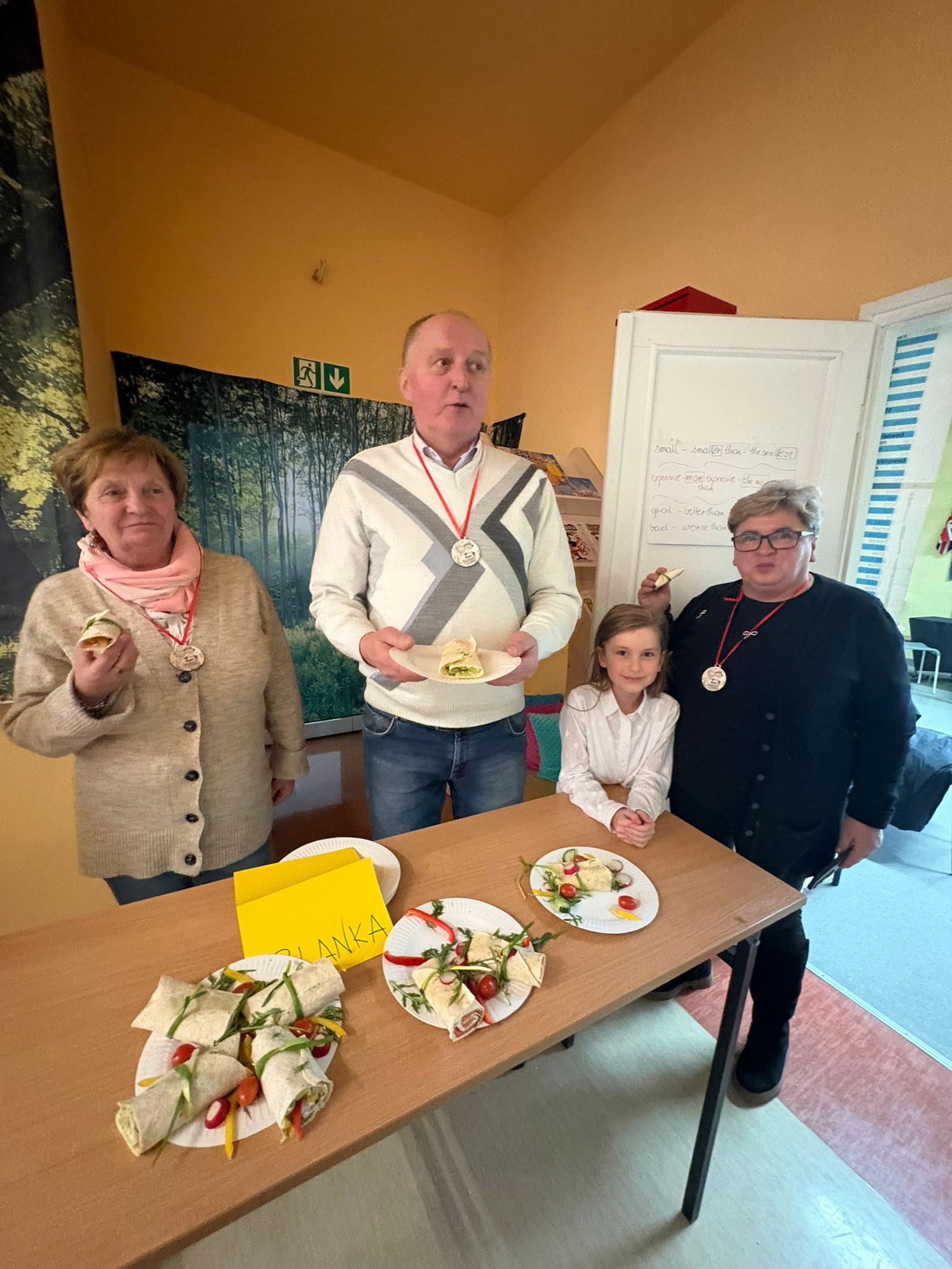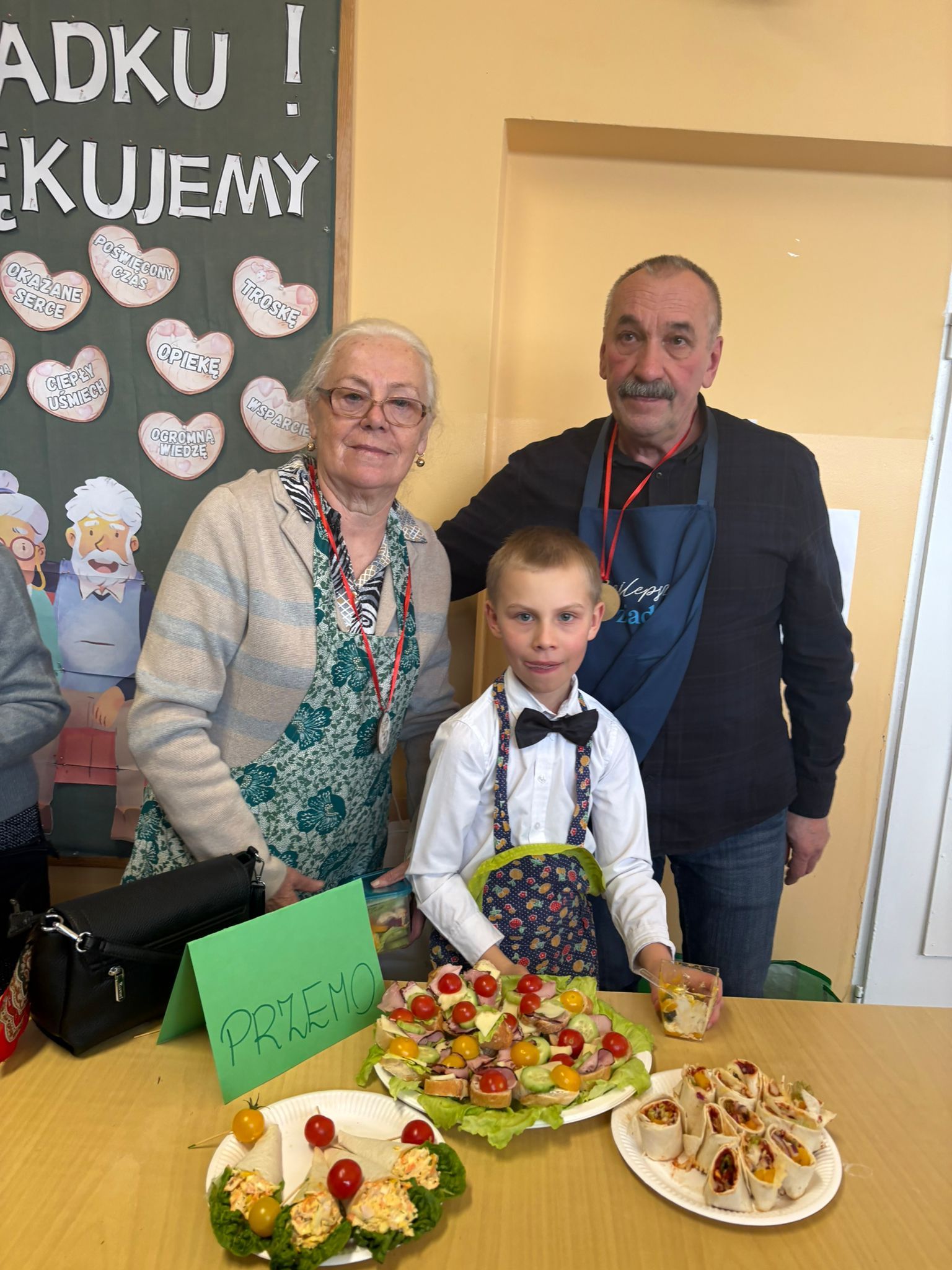 Na szkolnym korytarzu czekała też wyjątkowa galeria – wisiały tam podobizny Babć i Dziadków namalowane przez naszych uczniów, a goście z uśmiechem próbowali odnaleźć… siebie! ![]()